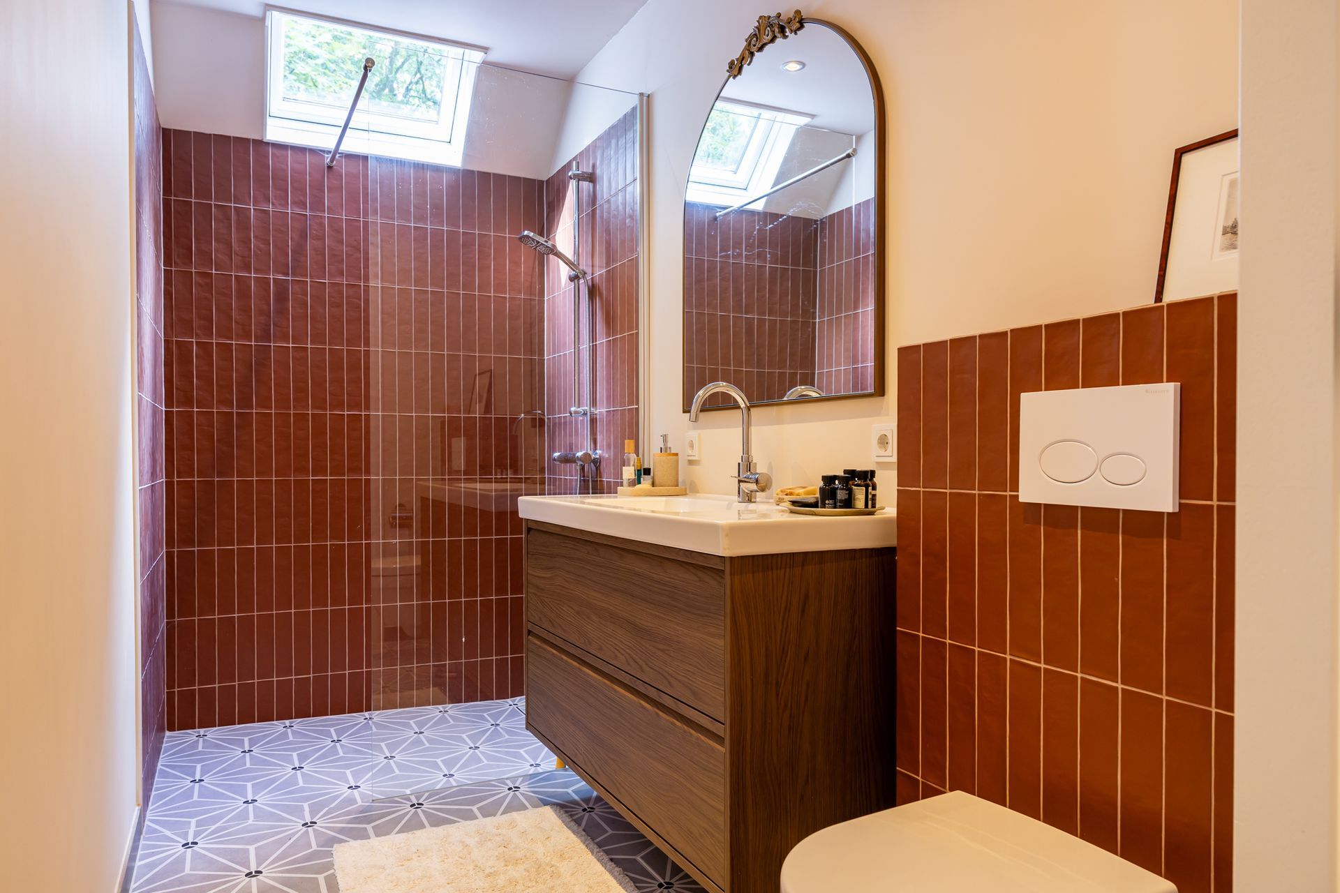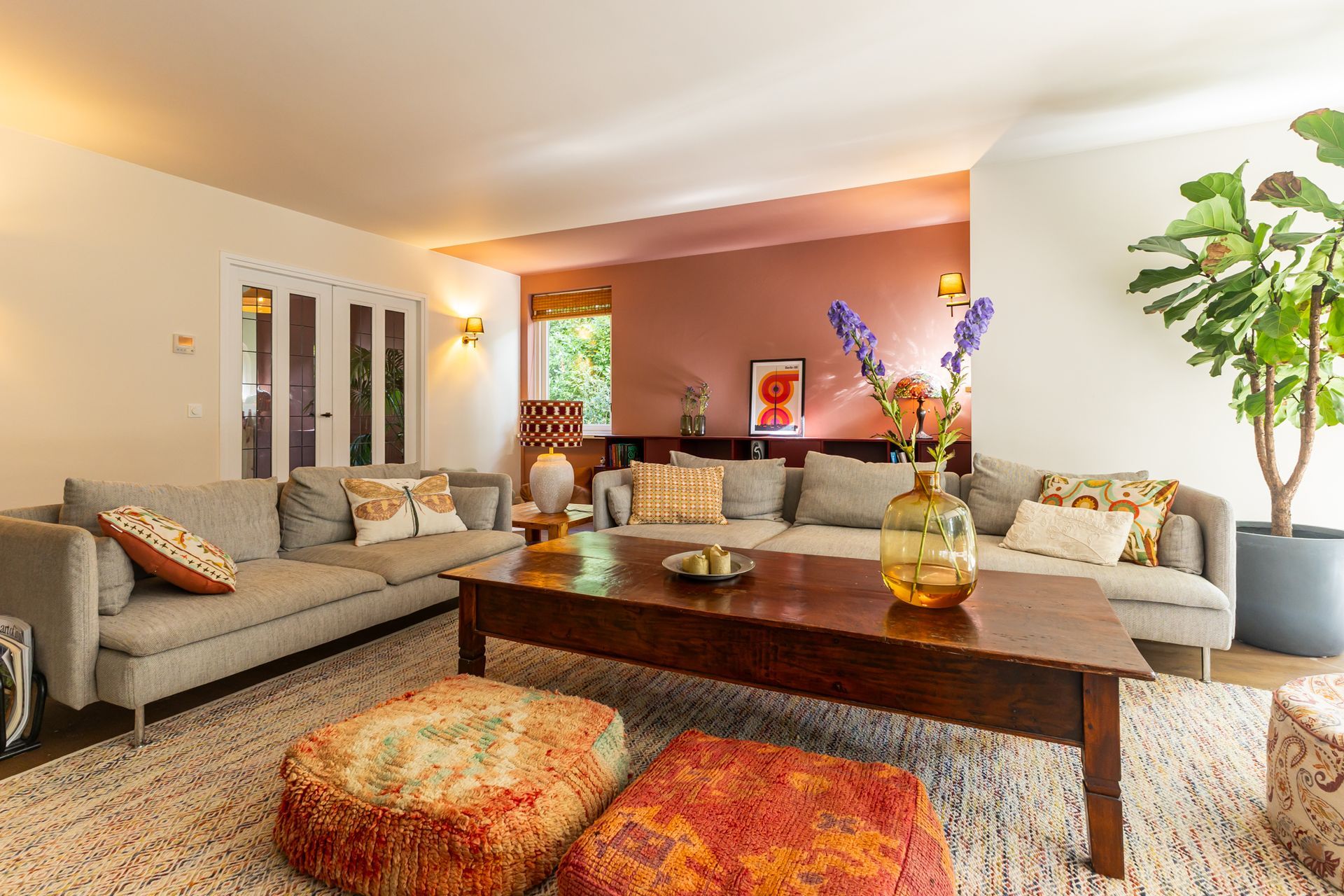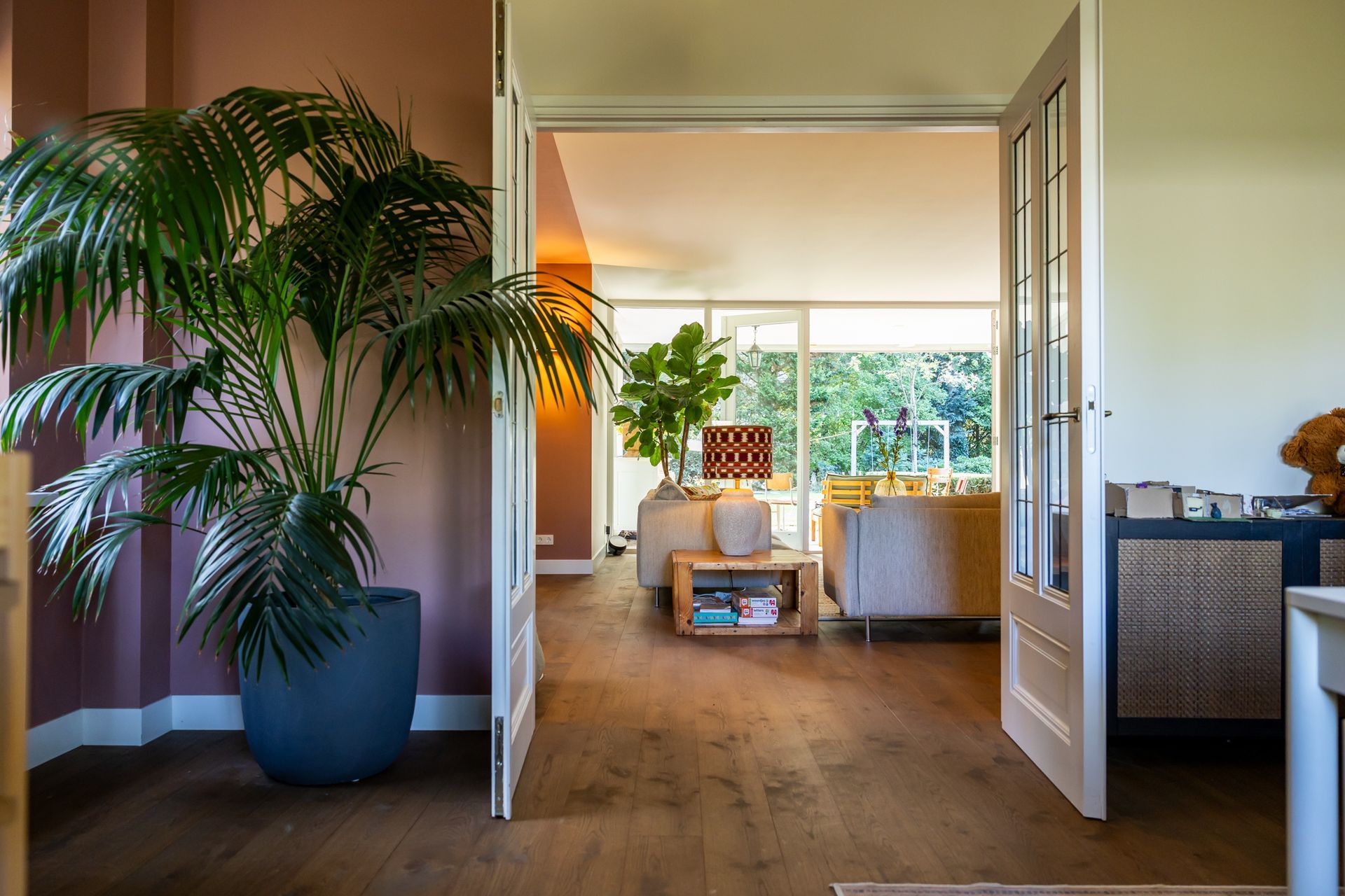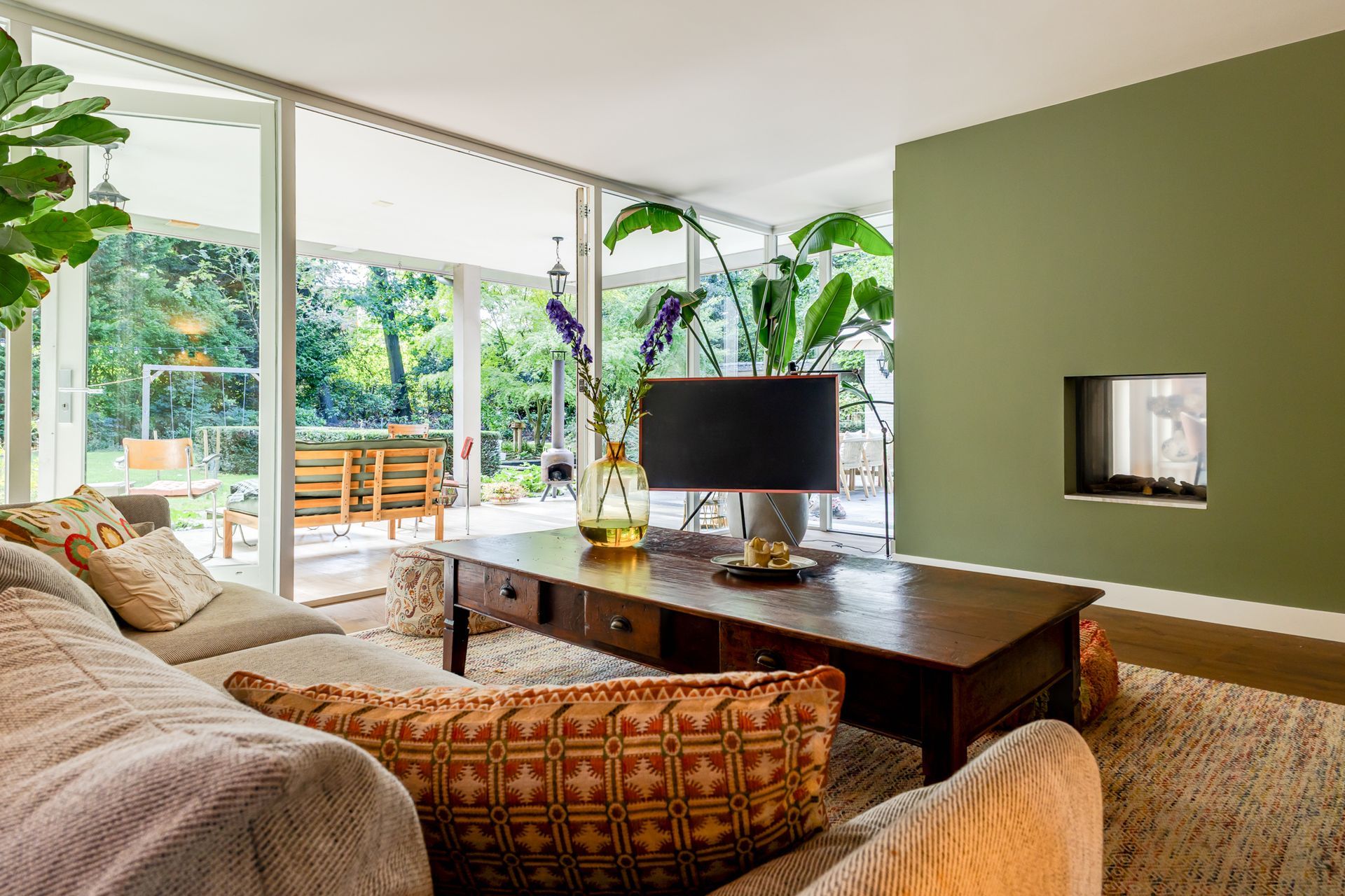Dankzij grote raampartijen en slimme zichtlijnen wordt het interieur verbonden met de tuin. Het daglicht verzacht de intensiteit van de kleuren en zorgt voor lucht en ruimte. Zo blijft het ontwerp dynamisch, maar comfortabel – een belangrijk uitgangspunt in dit project.