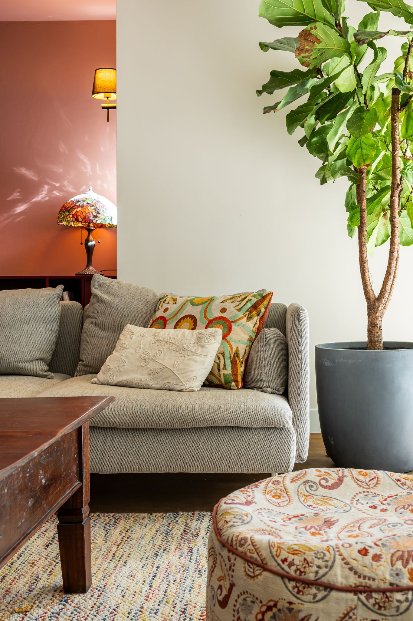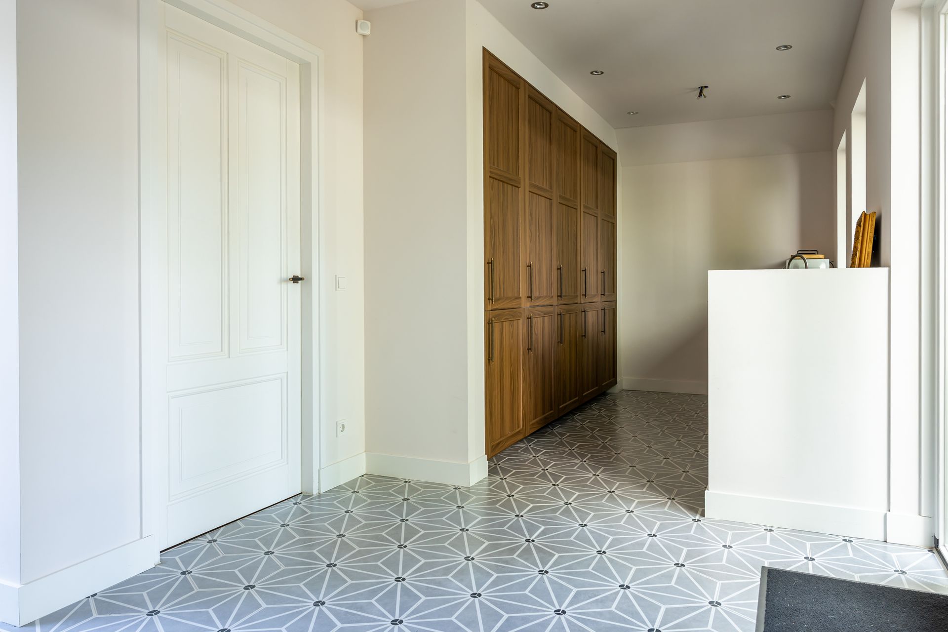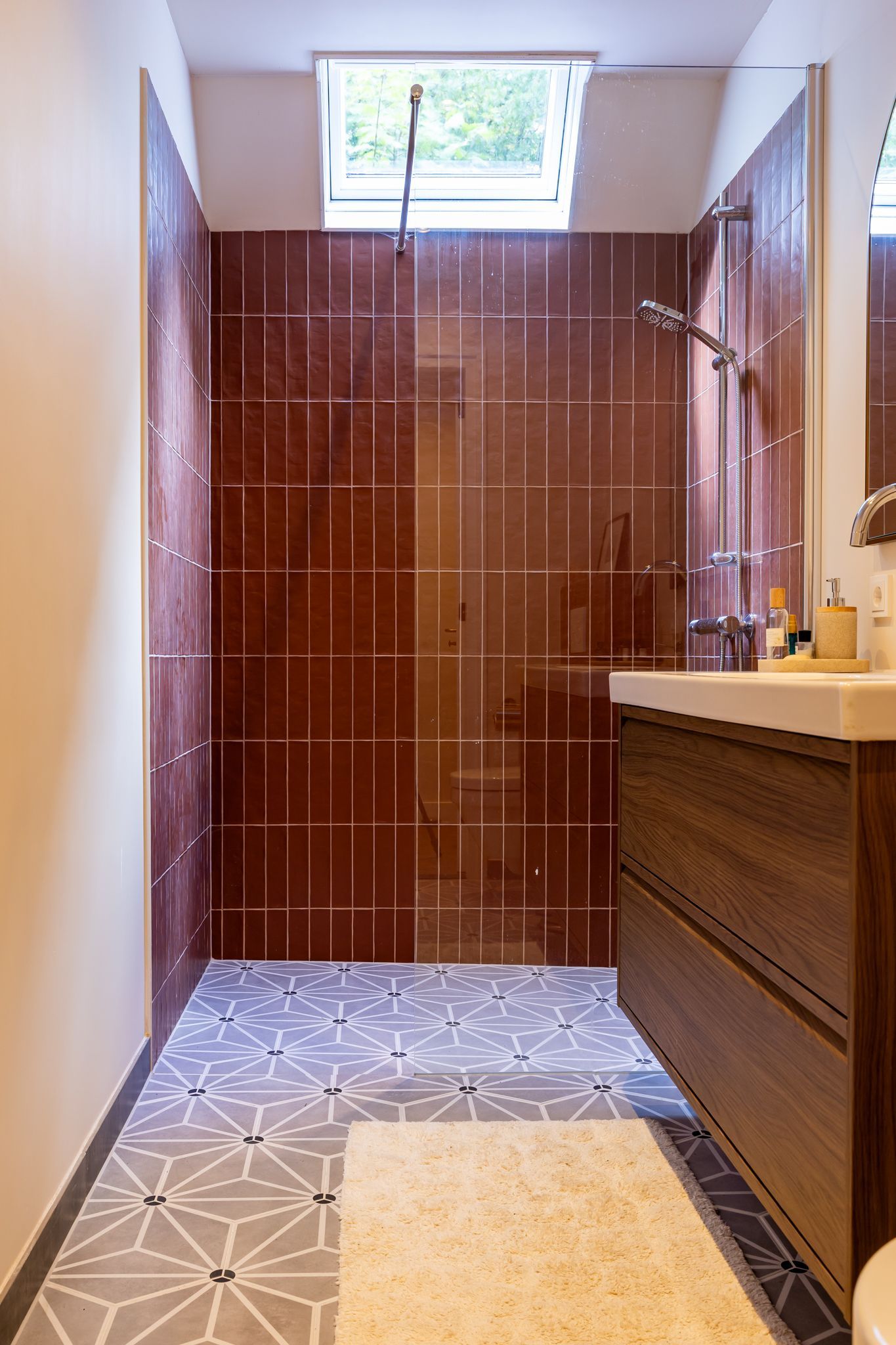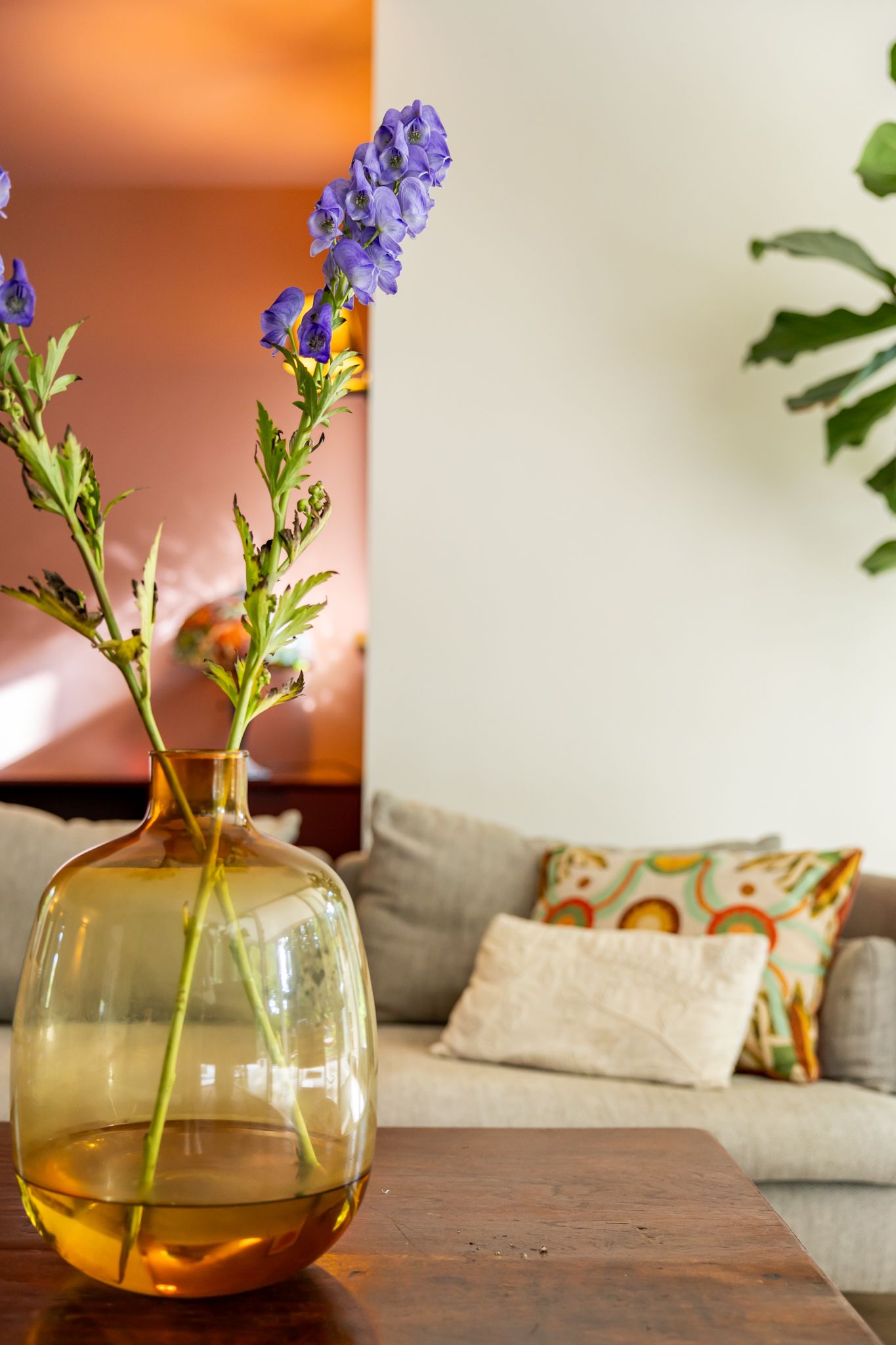 Dankzij grote raampartijen en slimme zichtlijnen wordt het interieur verbonden met de tuin. Het daglicht verzacht de intensiteit van de kleuren en zorgt voor lucht en ruimte. Zo blijft het ontwerp dynamisch, maar comfortabel – een belangrijk uitgangspunt in dit project.