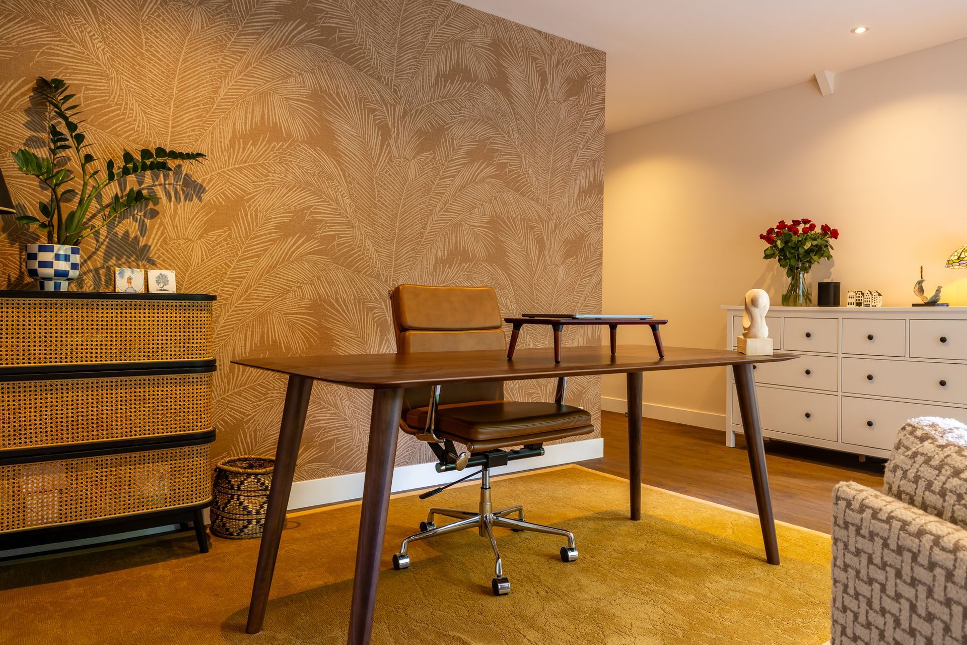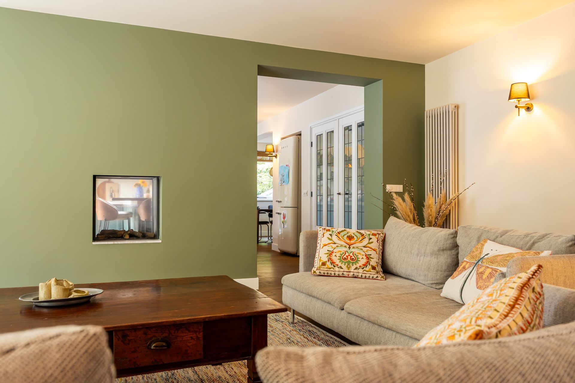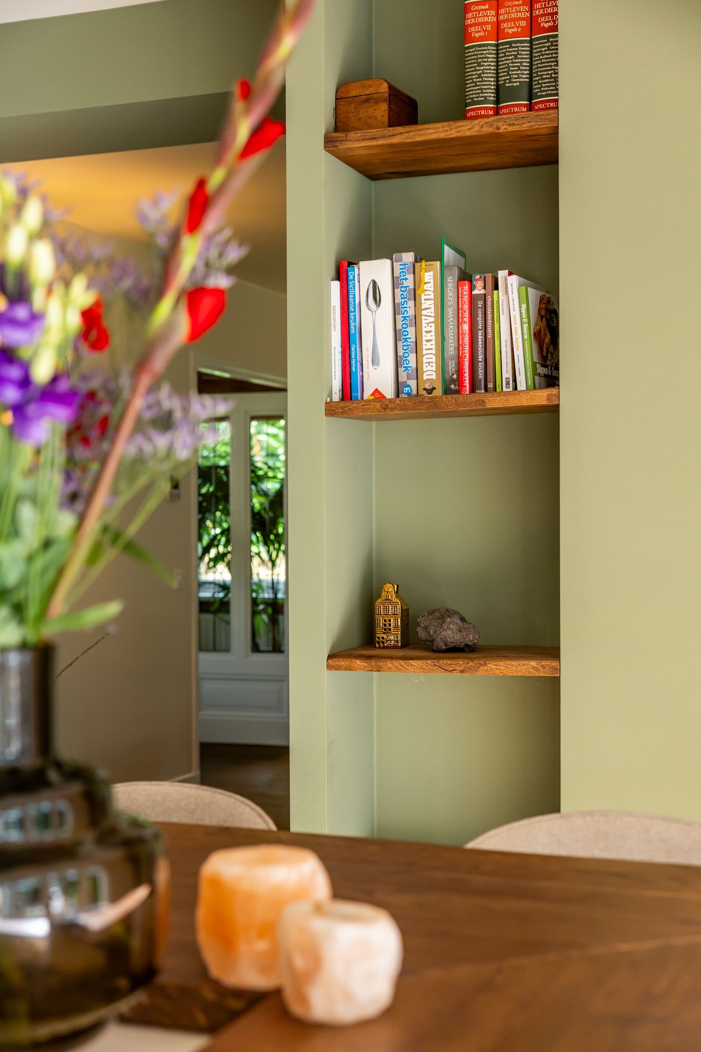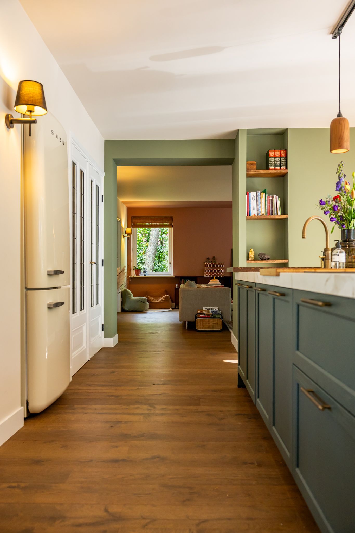 De basis van het interieur bestaat uit rijke, warme tinten en natuurlijke materialen. Groen speelt een hoofdrol en zet direct de toon: uitgesproken, maar zorgvuldig toegepast. In combinatie met hout, messing en zachte texturen ontstaat een gebalanceerd geheel waarin elke ruimte zijn eigen karakter heeft.