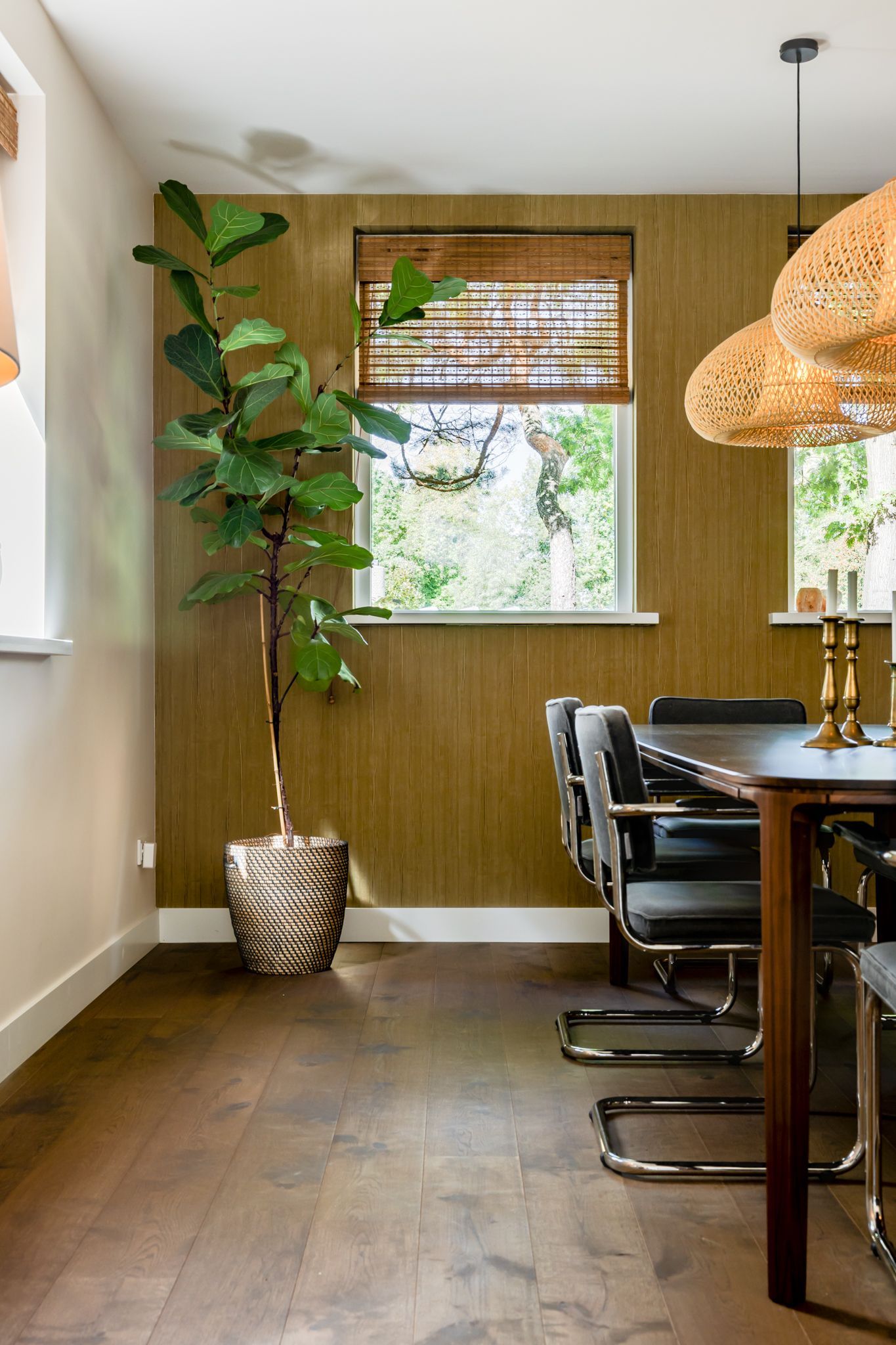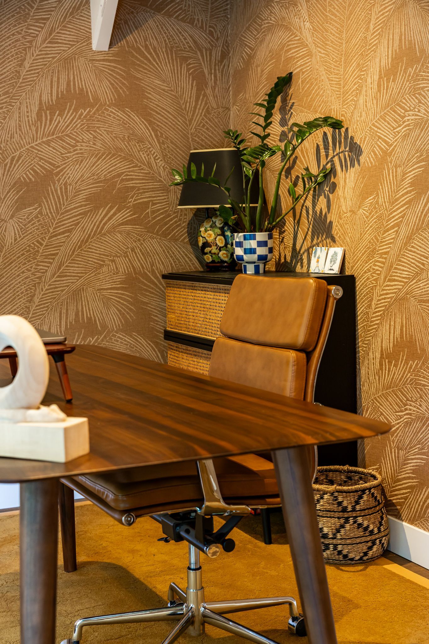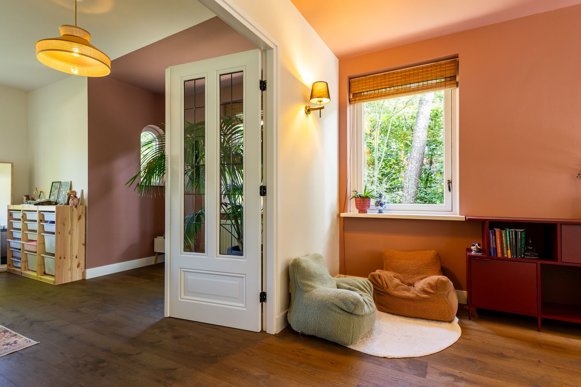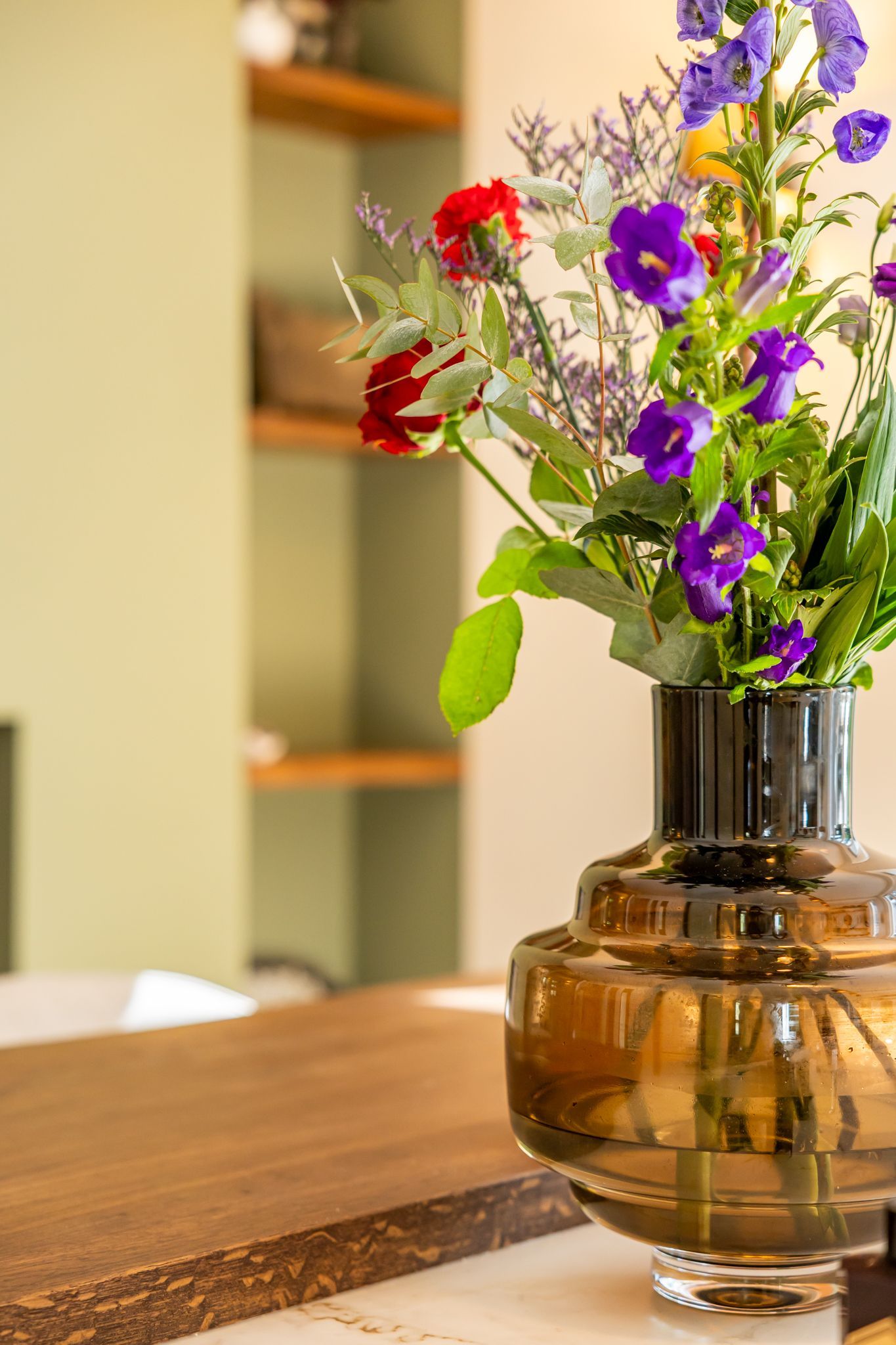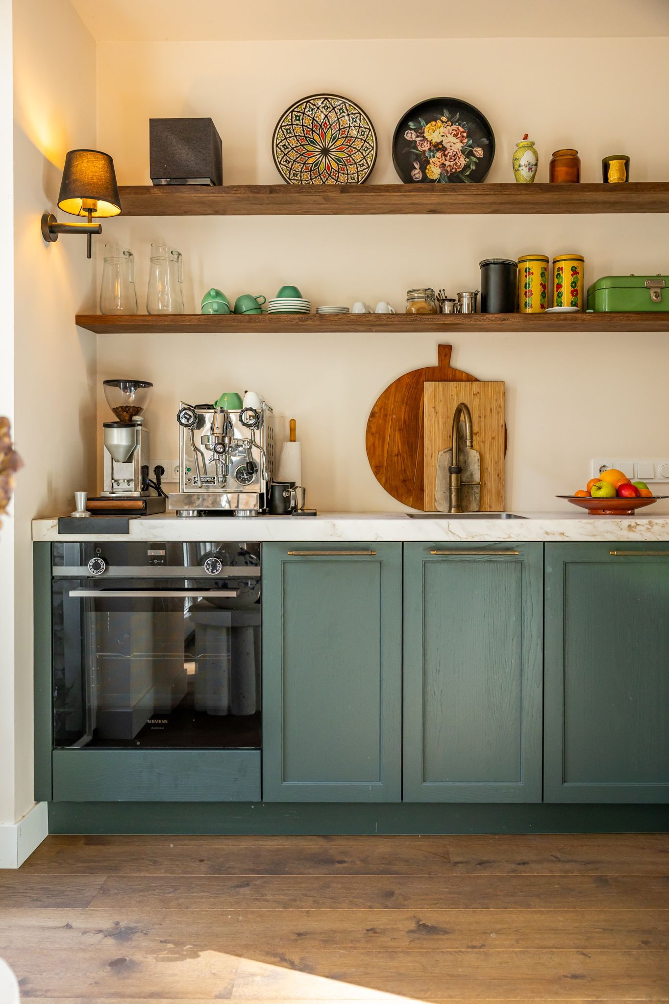 De basis van het interieur bestaat uit rijke, warme tinten en natuurlijke materialen. Groen speelt een hoofdrol en zet direct de toon: uitgesproken, maar zorgvuldig toegepast. In combinatie met hout, messing en zachte texturen ontstaat een gebalanceerd geheel waarin elke ruimte zijn eigen karakter heeft.