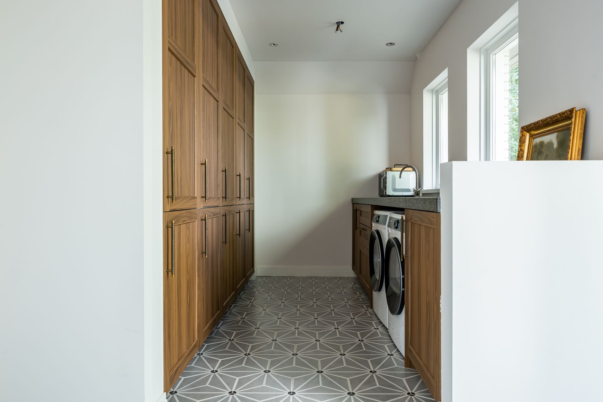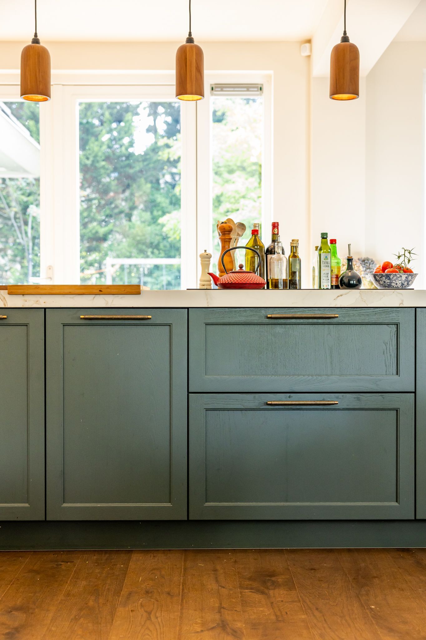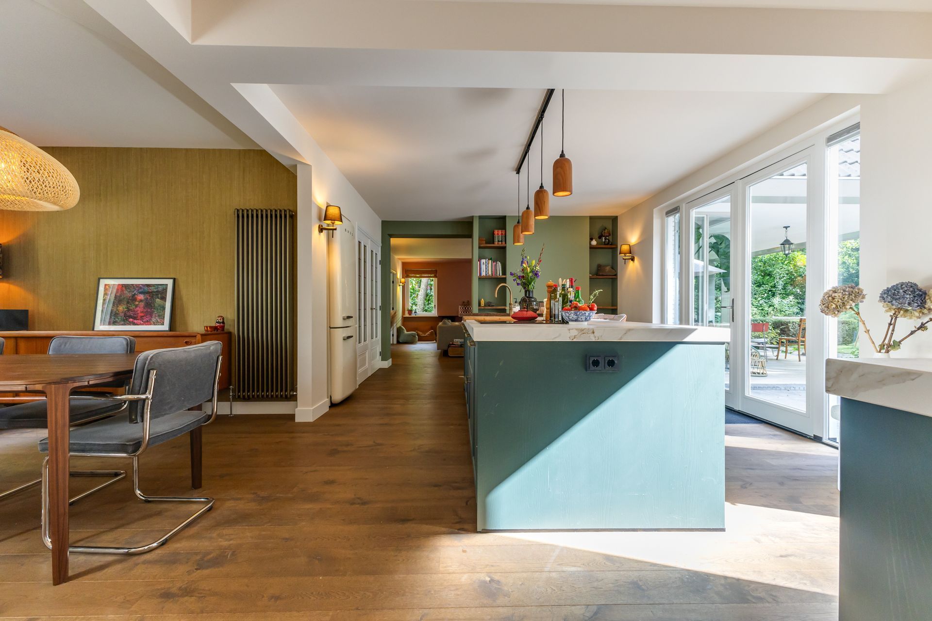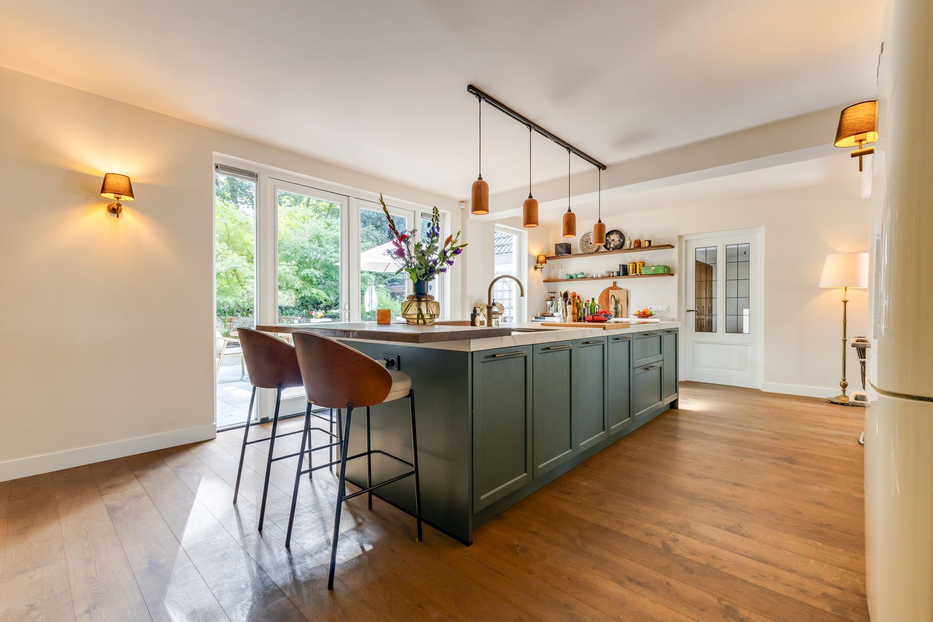 De open leefruimte is bewust vormgegeven met duidelijke zones. Het keukeneiland vormt het centrale ankerpunt van de woning: robuust, functioneel en visueel sterk. De diepe groentint in combinatie met warme houtaccenten en verfijnde details maakt de keuken tot een statement, zonder de rest van het interieur te overheersen.