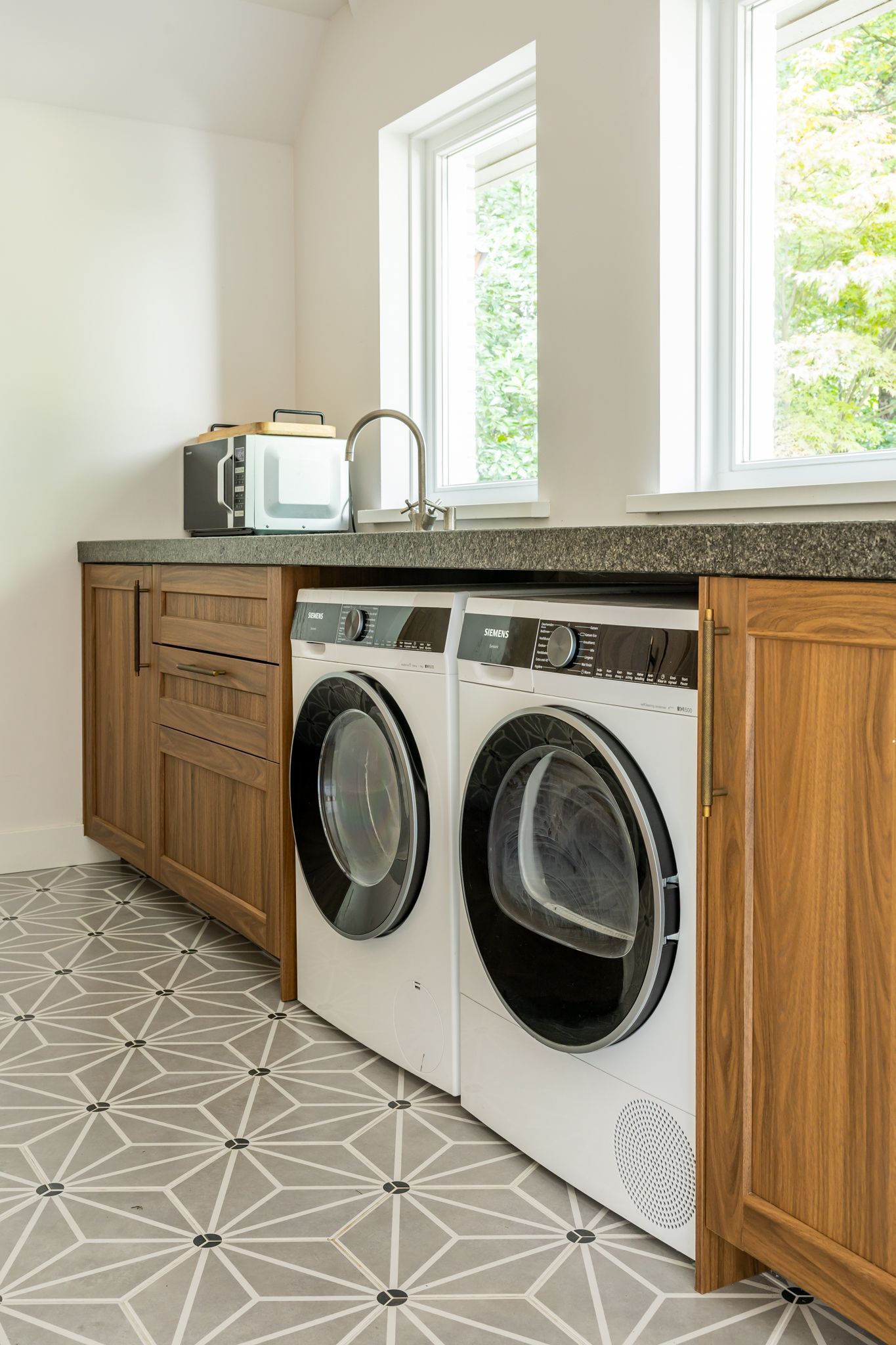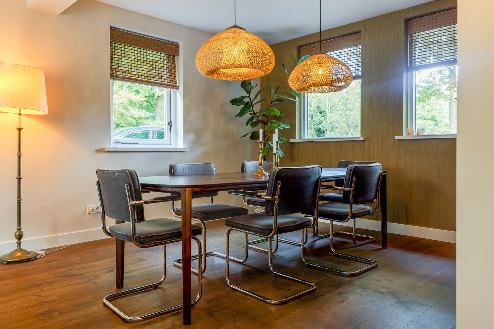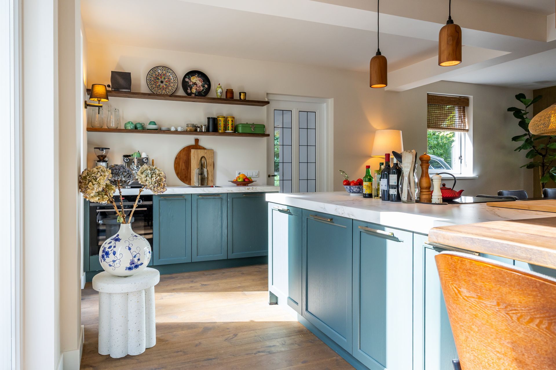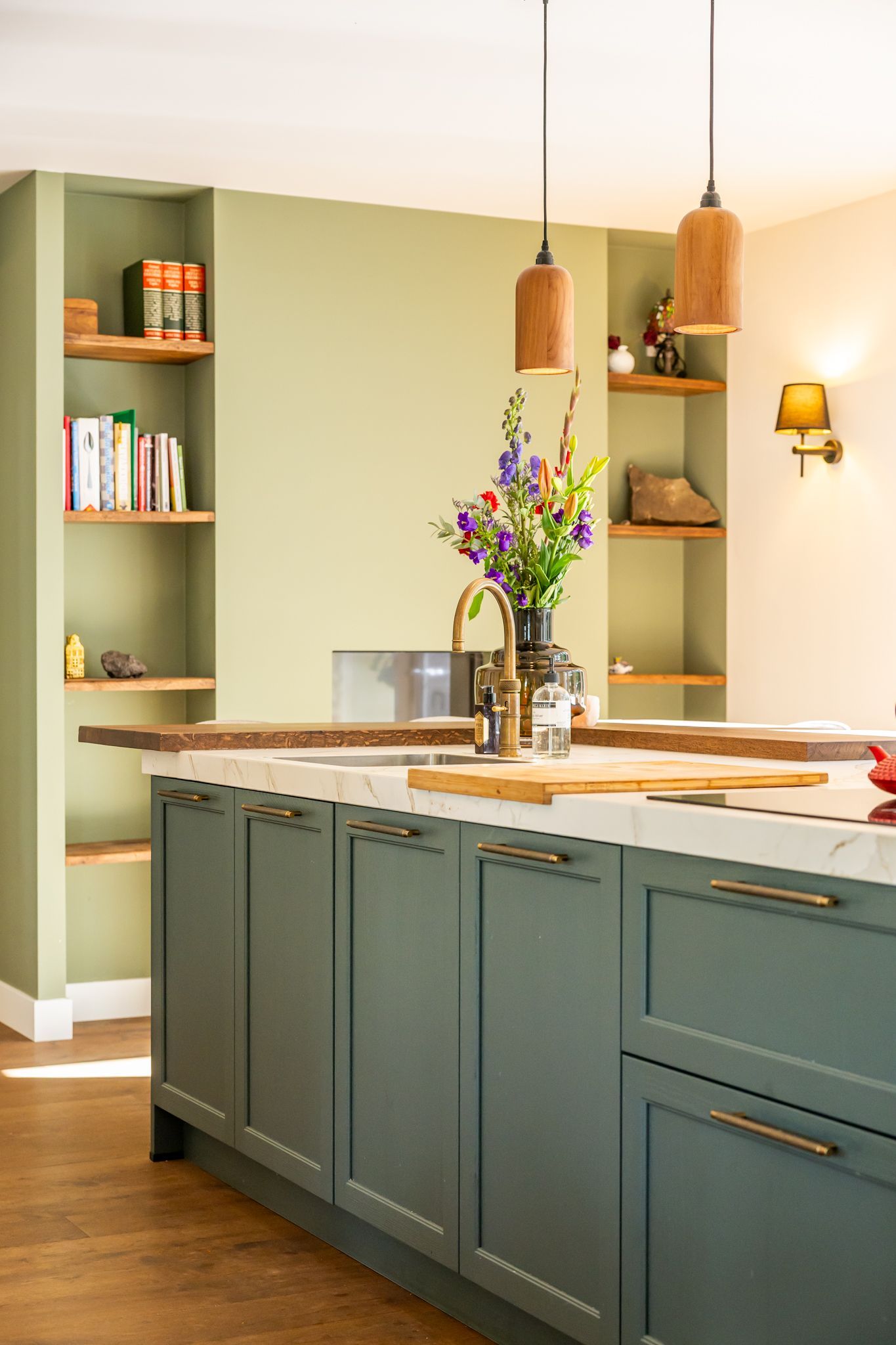 De open leefruimte is bewust vormgegeven met duidelijke zones. Het keukeneiland vormt het centrale ankerpunt van de woning: robuust, functioneel en visueel sterk. De diepe groentint in combinatie met warme houtaccenten en verfijnde details maakt de keuken tot een statement, zonder de rest van het interieur te overheersen.