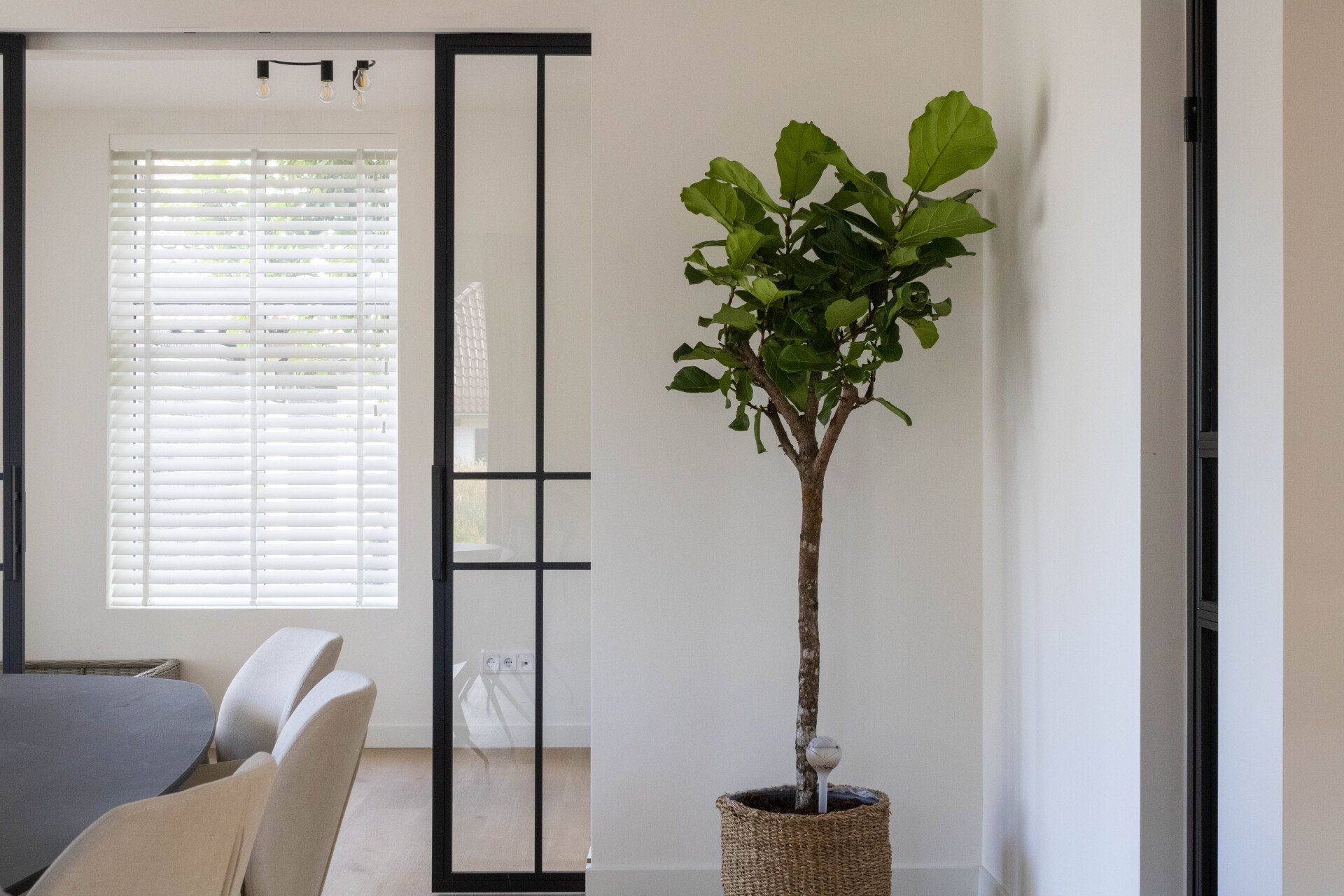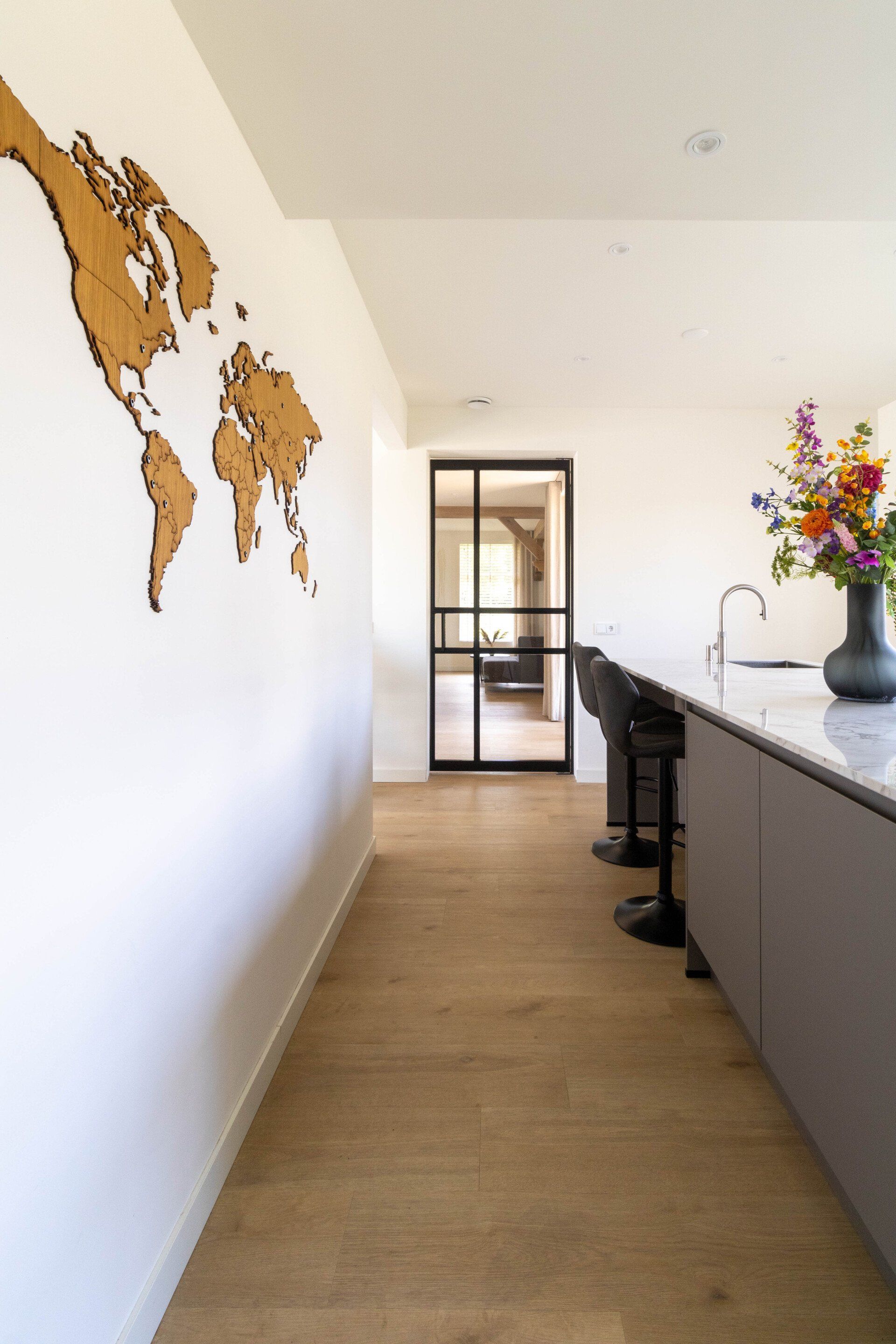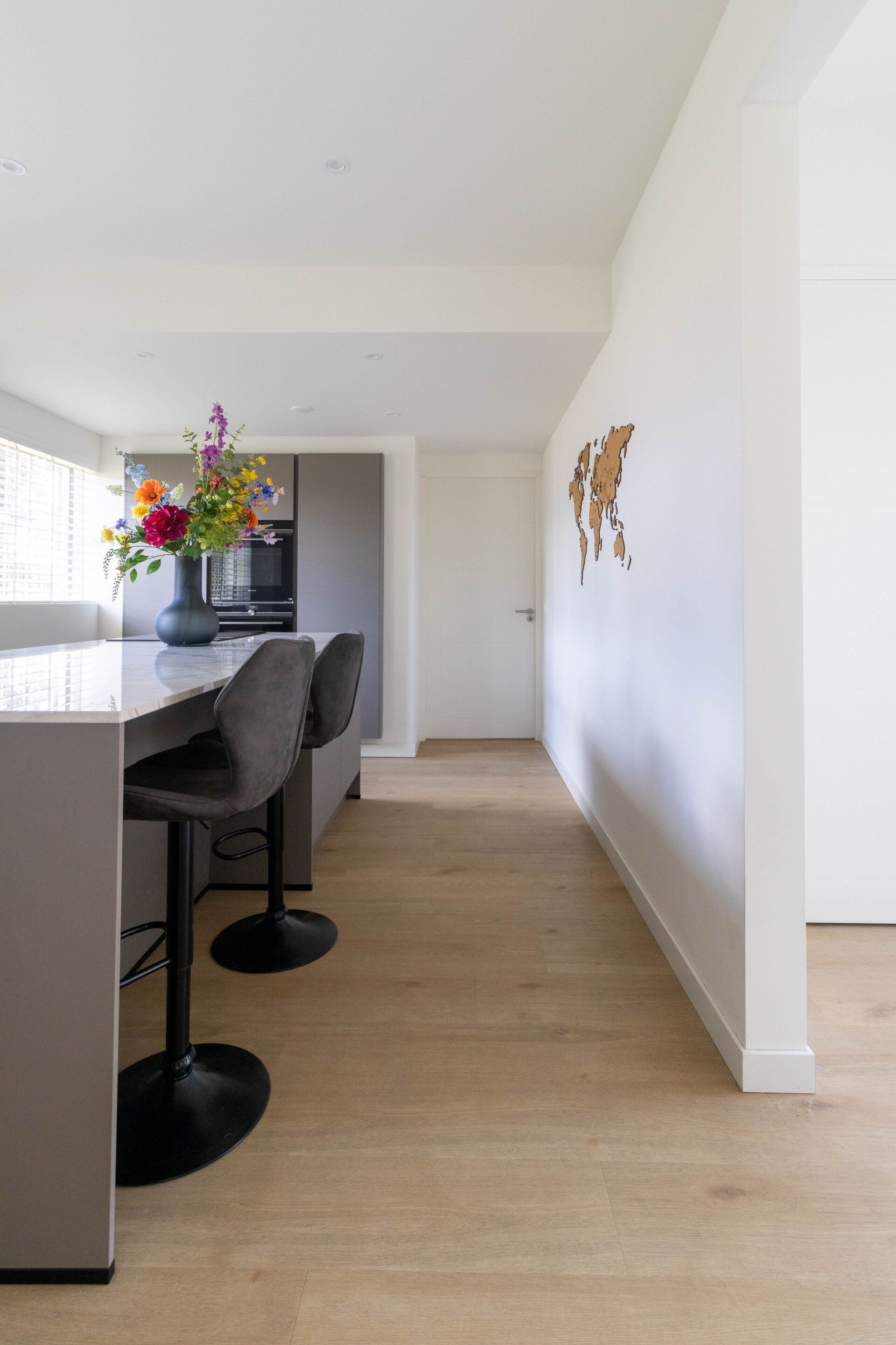Er waren weinig eisen, alleen dat het een nieuwe moderne en frisse uitstraling moest hebben. Dit h ebben we gecreëerd door met lichte tonen en frisse meubels te werken. Ook werd het hout wat in de woning is opgeschuurd en in het licht eiken gehouden. De deuren werden vervangen door glazen deuren om dat extra licht en openheid te creëren.
