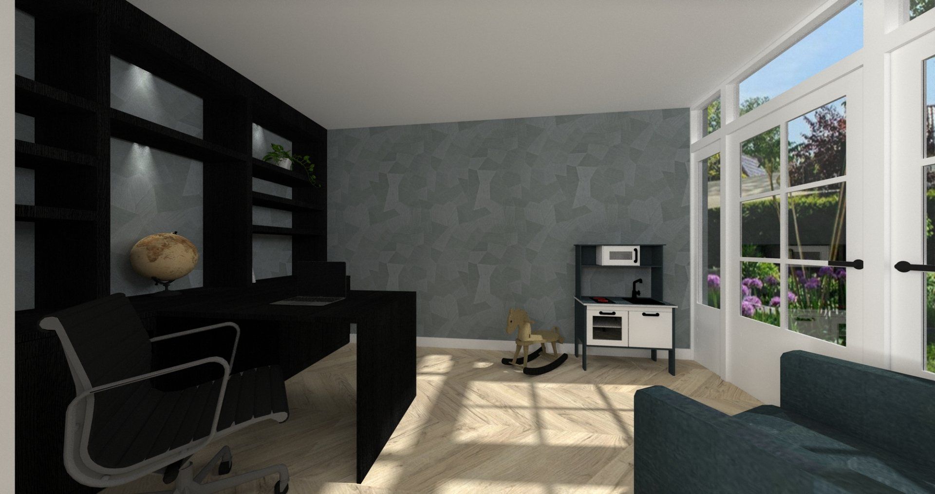 De studeerkamer die nu vooral al speel en rommelkamer gebruikt word tover ik om tot een luxe en stralende werkruimte die samenkomt met de rest van het huis. De kast heeft een klassieke uitstraling doordat ik met hout en oude vormen van bureaus gewerkt heb.