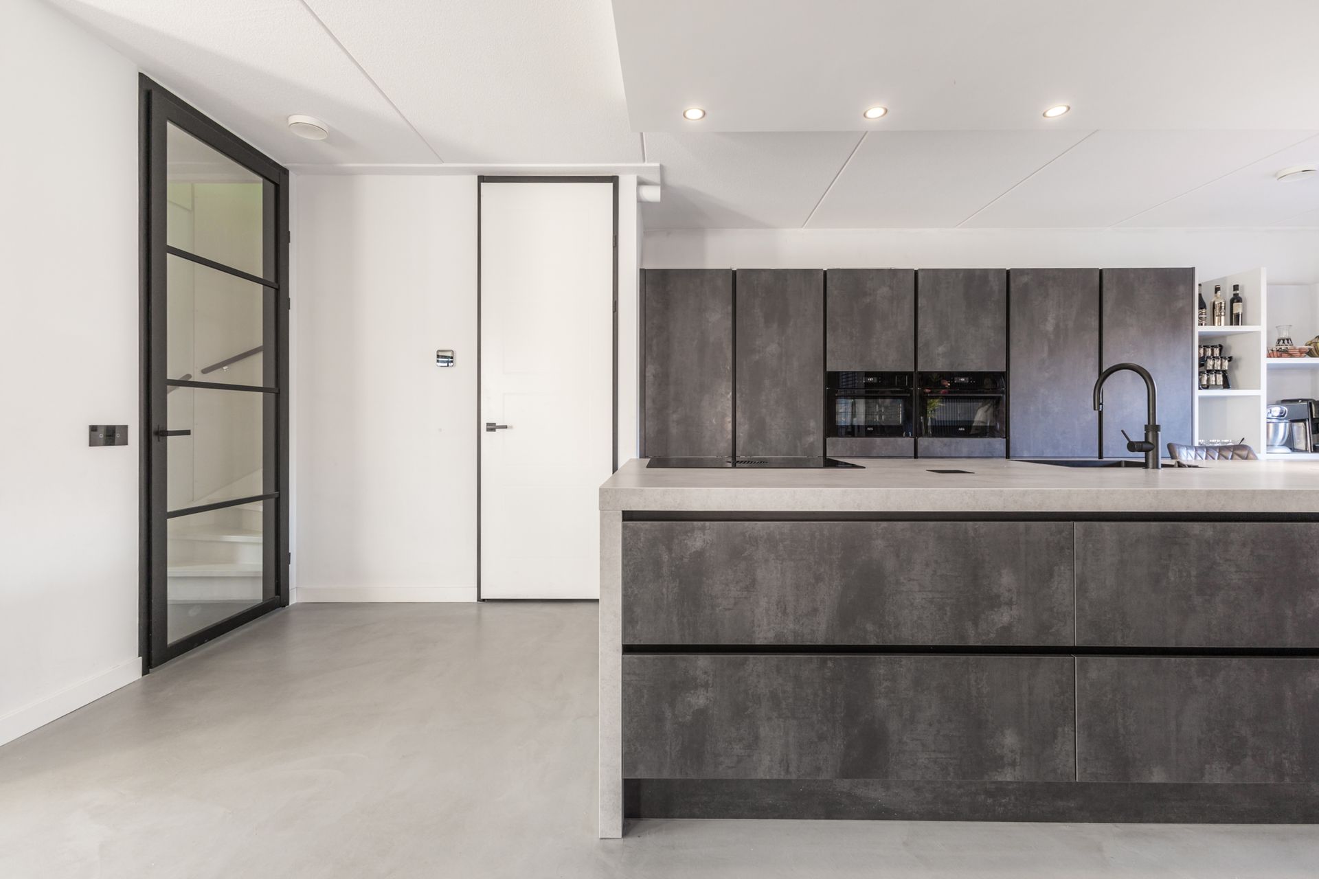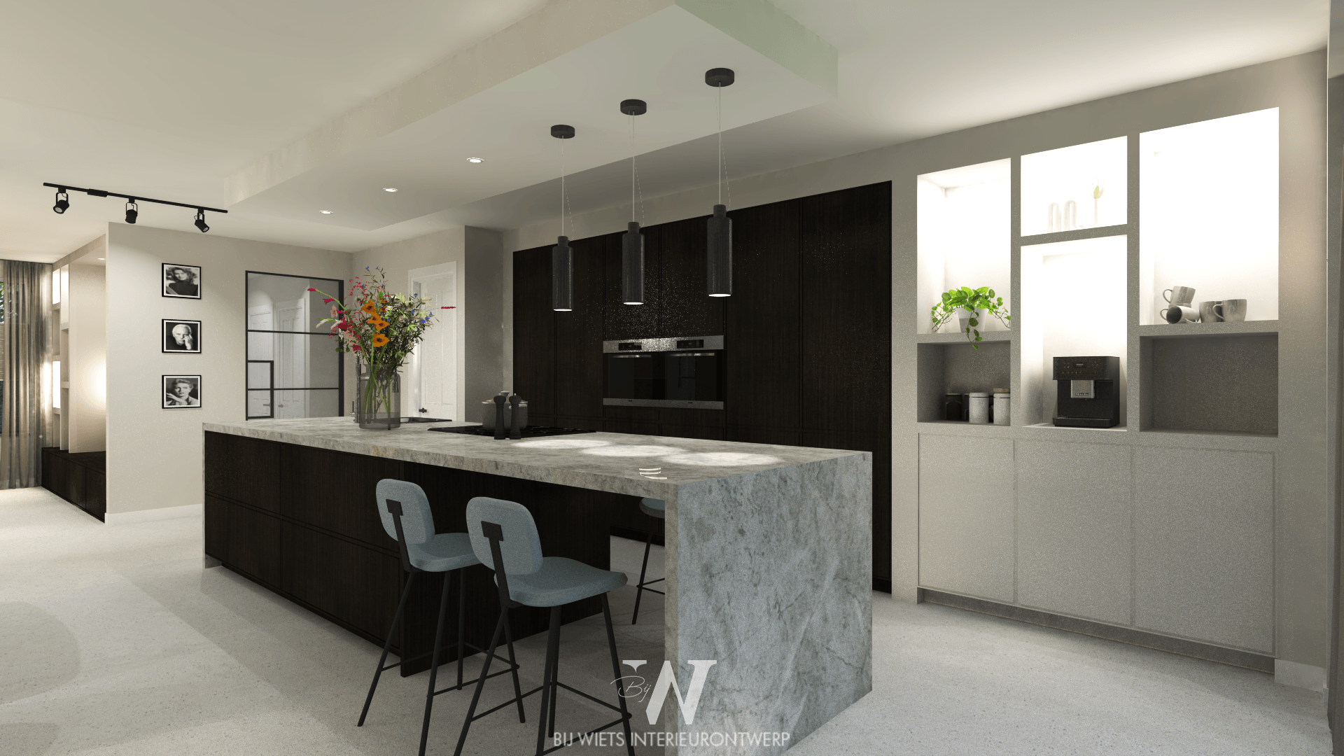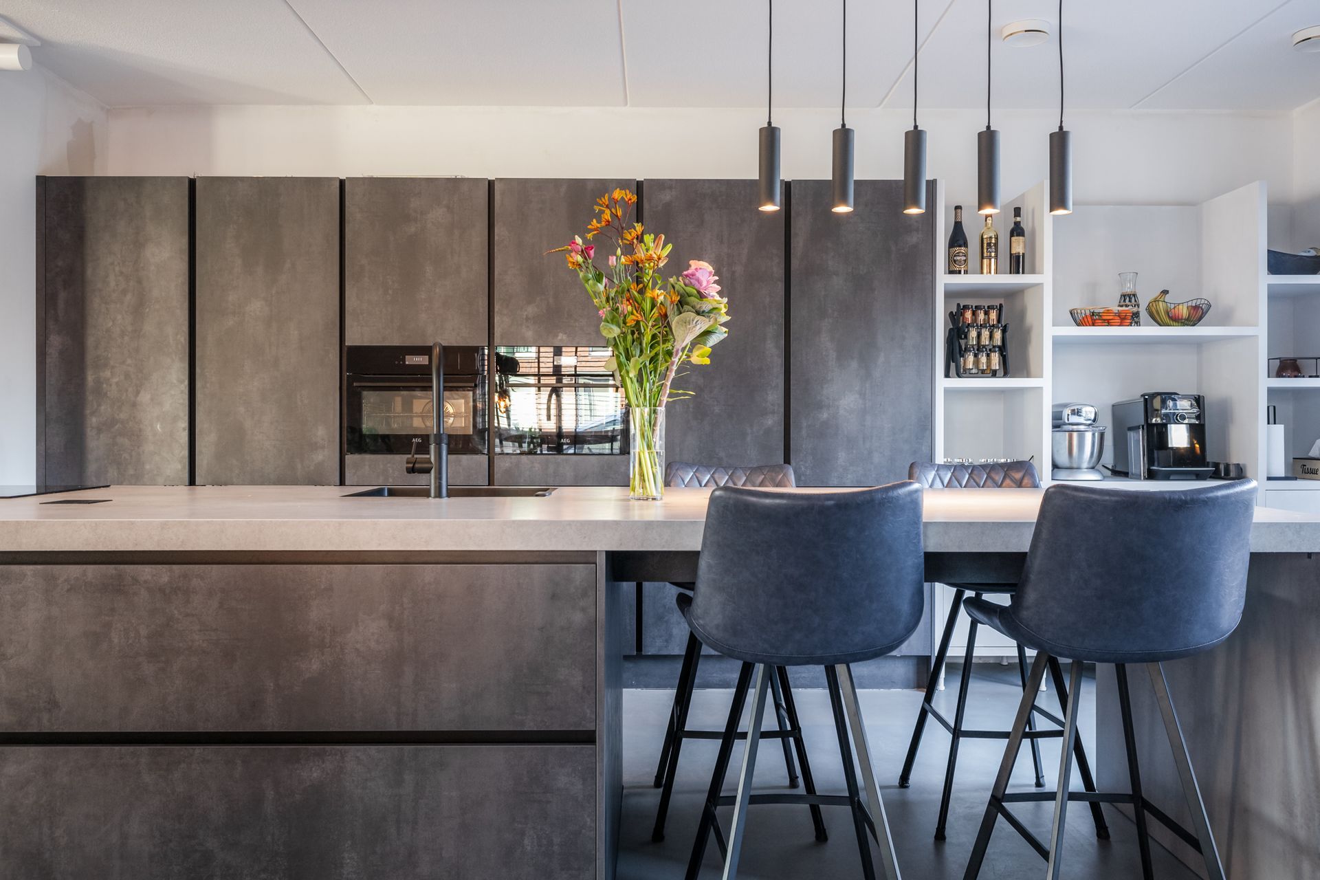 Een warm maar moderne uitstraling, dat moest het interieur hebben. Door dat er een groot statement gezet werd met de keuken die in een die grijze gemêleerde kleur geplaatst is, was het belangrijk dat het toch een warm en sfeervol geheel zou worden met de koele tonen.
