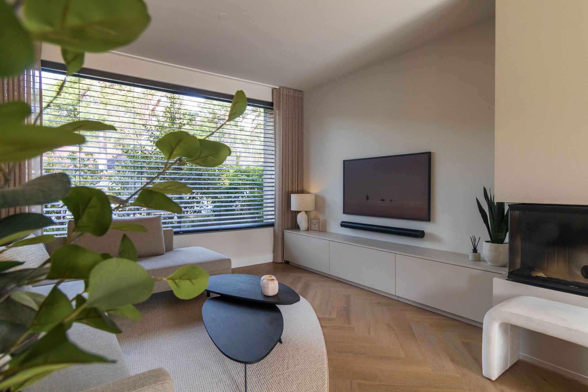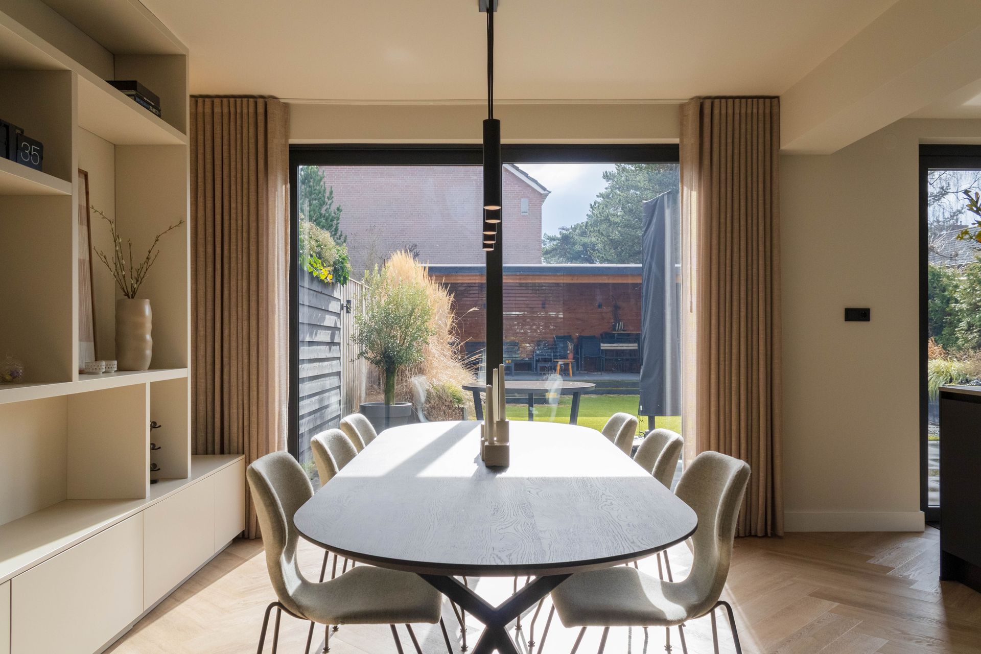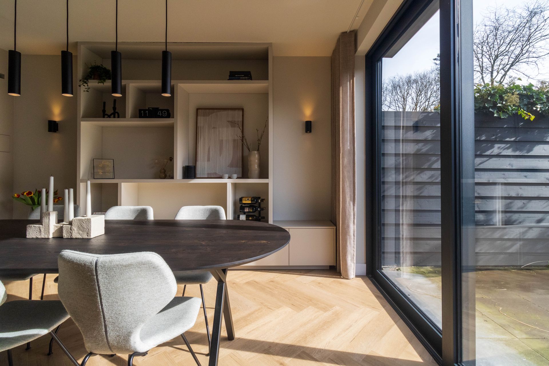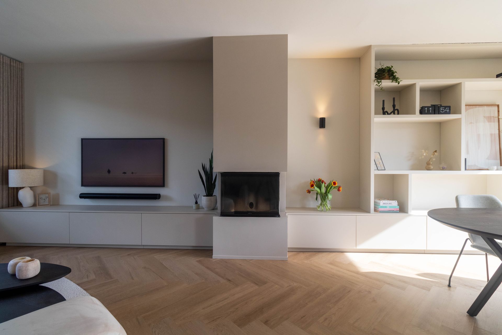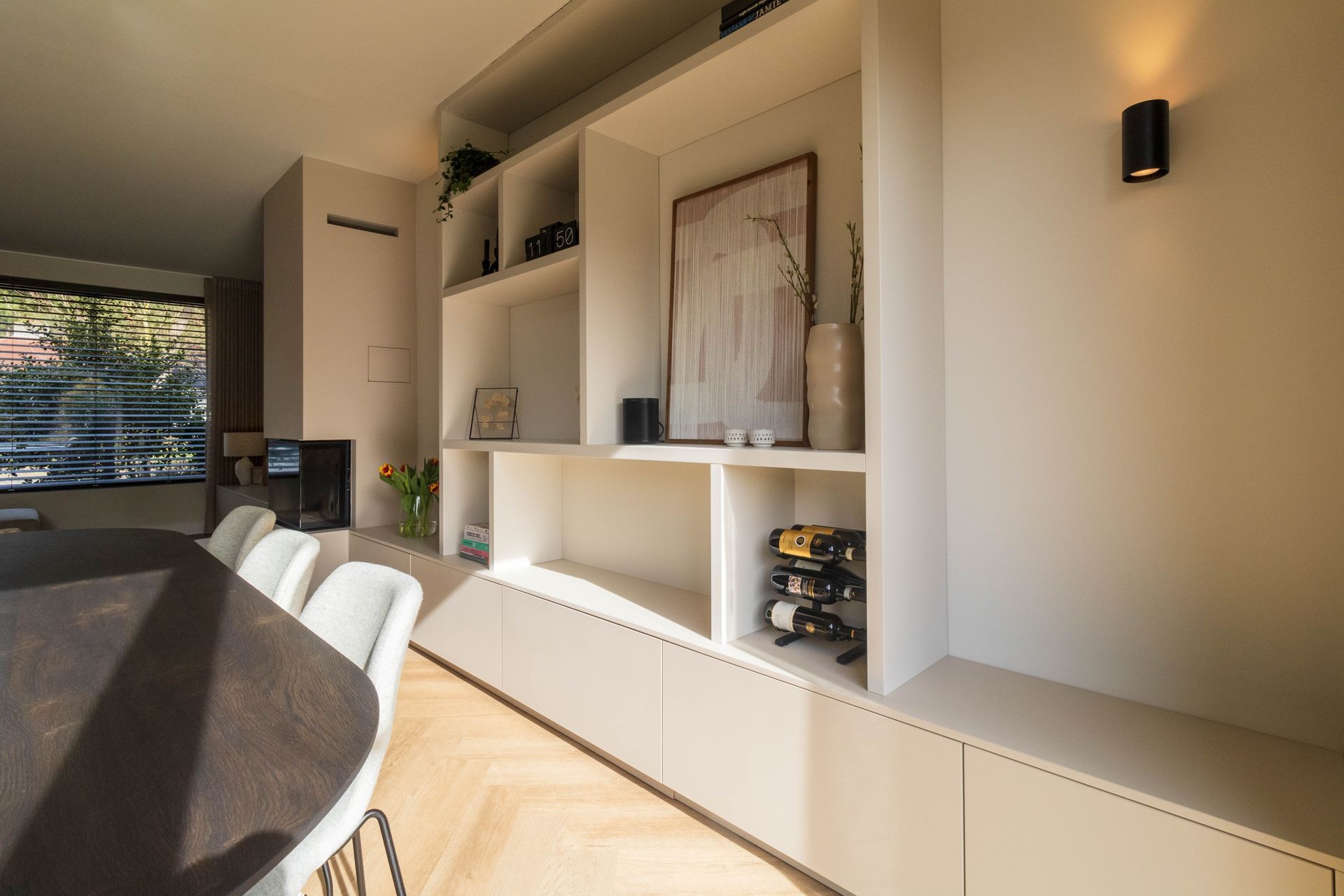 De woonkamer een eethoek wordt met elkaar in verbinding gebracht door een op maat gemaakte meubel. Dit meubel is in dezelfde kleur als de muur waardoor het geheel niet te druk wordt in de ruimte. Door de open vakken kan je het geheel leuk aankleden en onder in het meubel zitten 2 lades die er uit kunnen zodat het in de toekomst ook een bureautje kan worden voor kinderen.