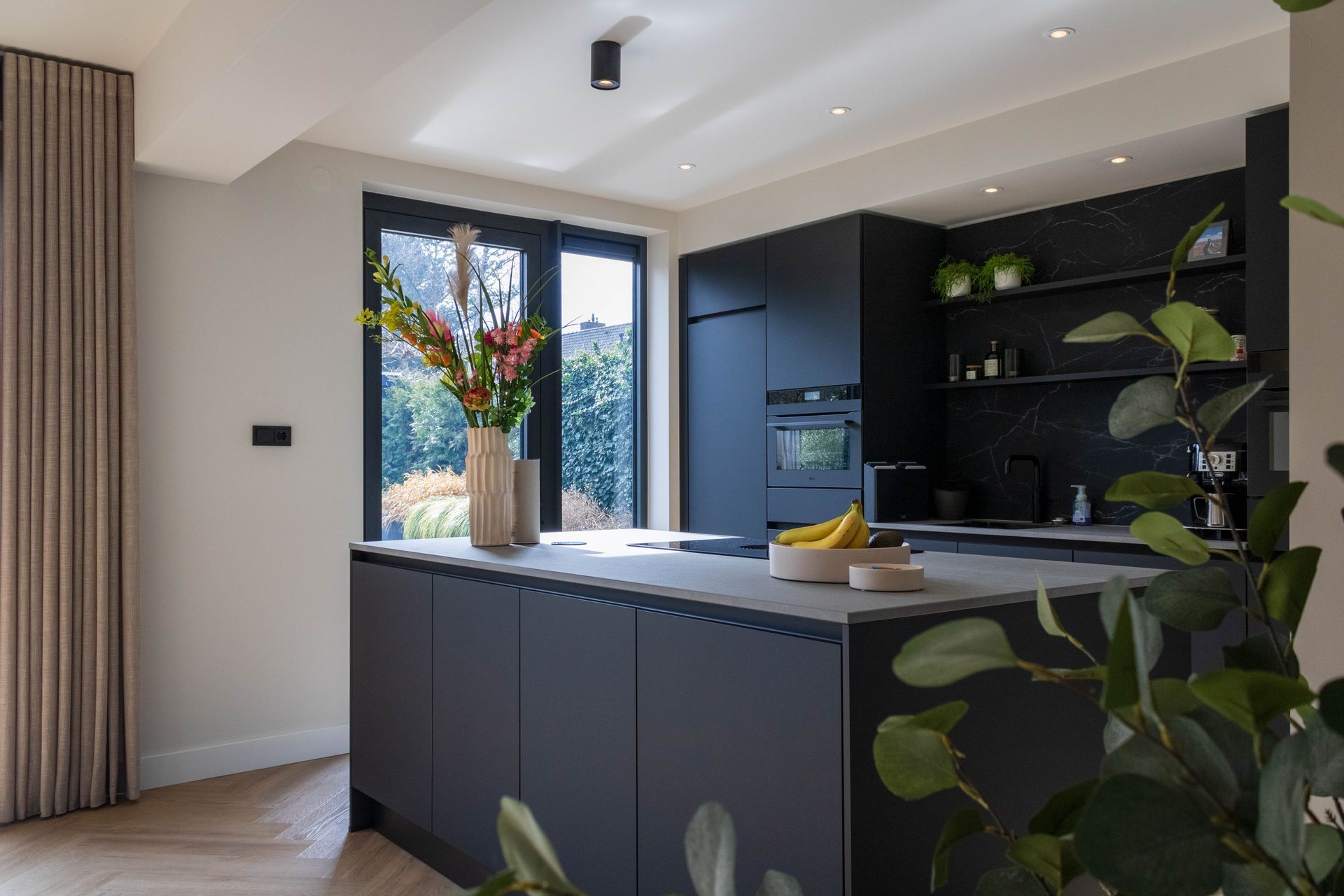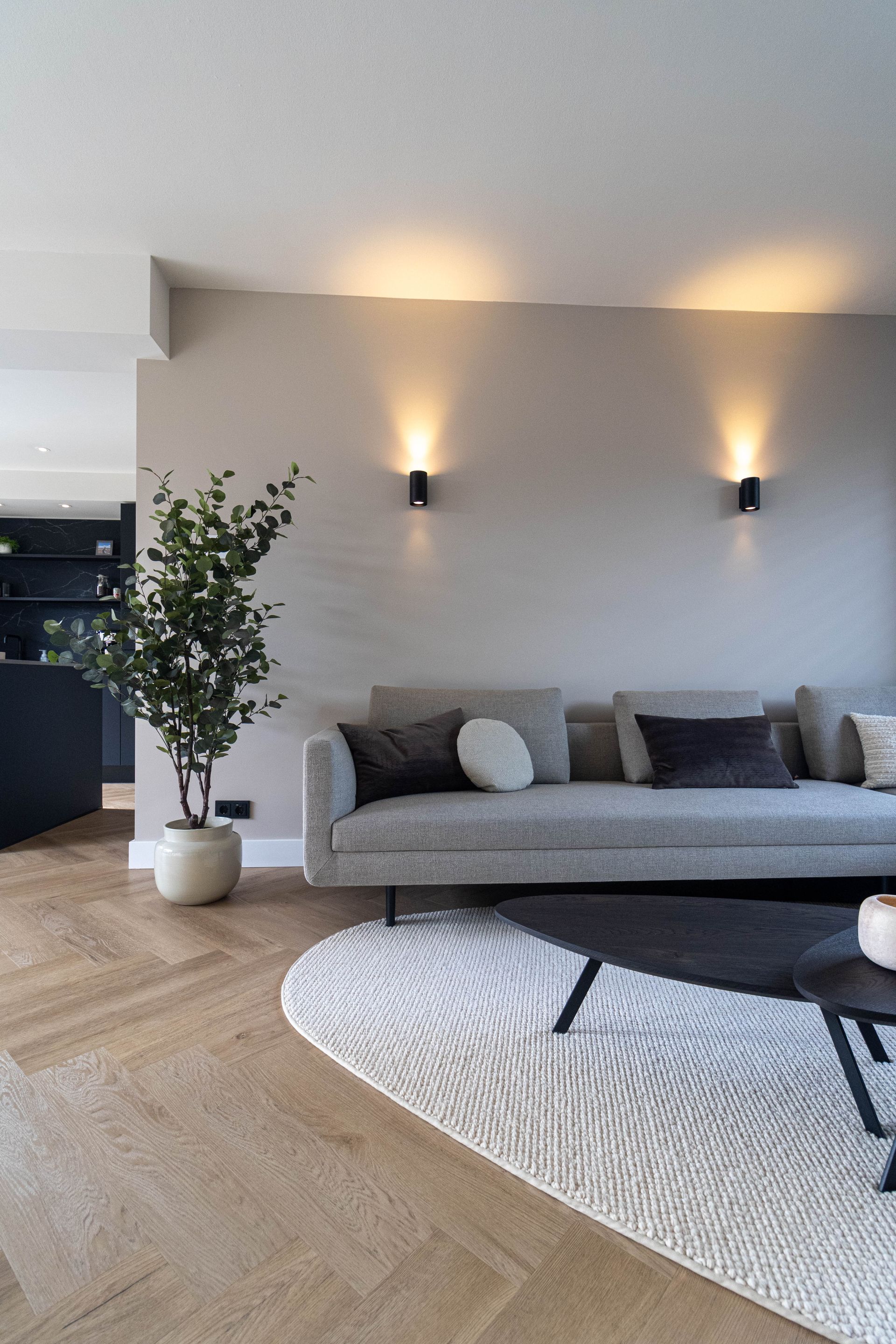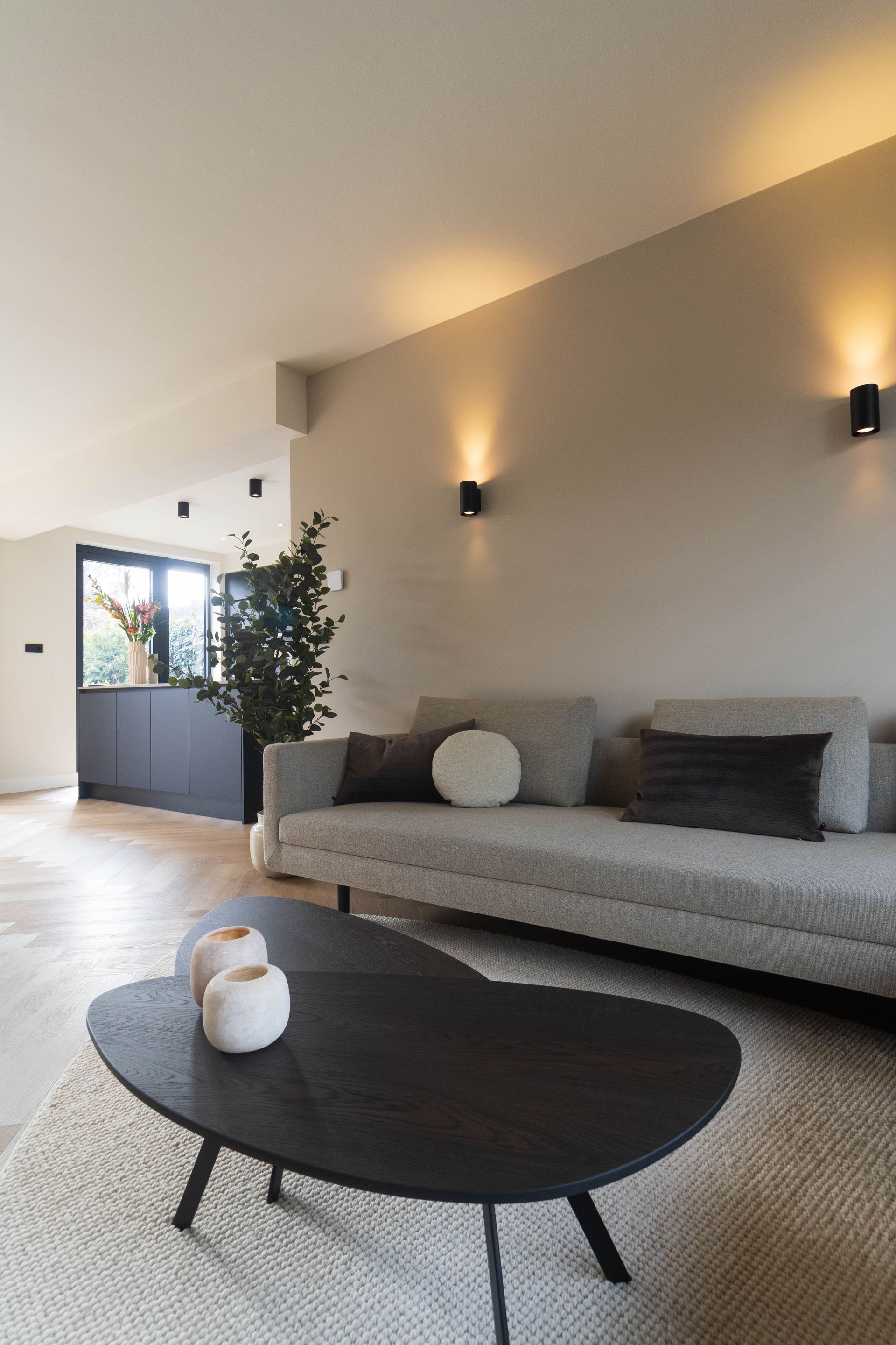 Hier zijn wij mee aan de slag gegaan en hebben een rustig ton sur ton pallet gecreëerd wat aangesterkt wordt door de zwarte materialen zoals de keuken maar ook de eettafel. Dit gecombineerd met de meubelen van Design on stock maat een fris en compleet beeld.